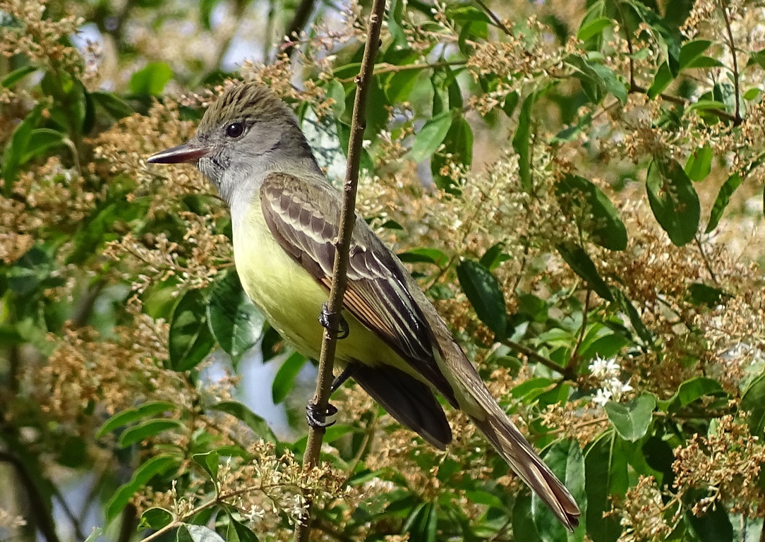 Great Crested Flycatcher May 24, 2016 / Rebecca / 4 Comments A Great Crested Flycatcher sitting on a branch in the top of a bush. “A well-developed sense of humor is the pole that adds balance to your steps as you walk the tightrope of life.” ~William Arthur Ward