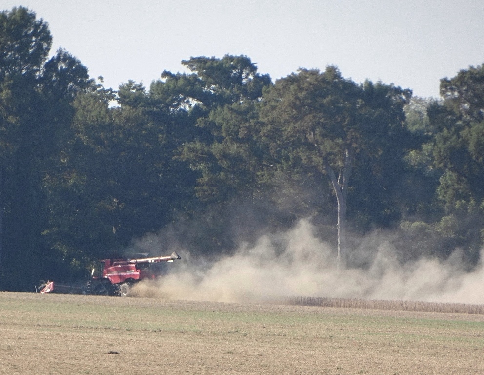 combine harvesting soybeans in the back of a field