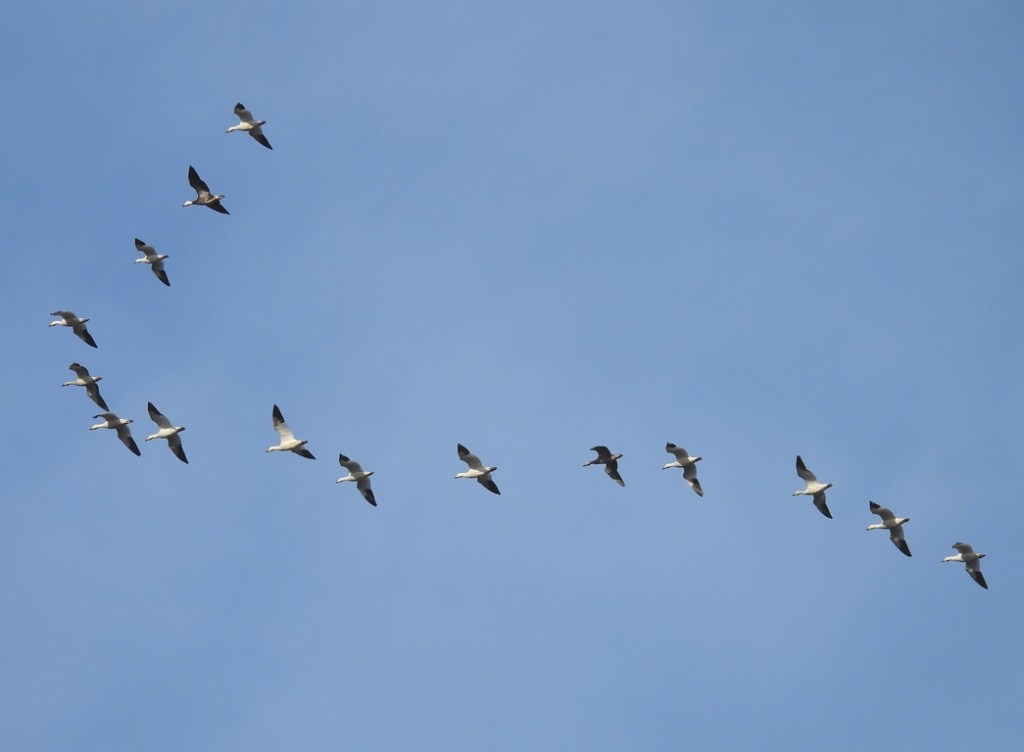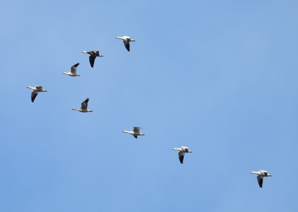 I was at home, going about my usual routine, when I heard a commotion outside. At first, I tried to ignore it, but the clamor continued. Curious, I looked out the front window and was thrilled to see long strings of Snow geese soaring high in the sky over the fields adjacent to my house. What an amazing sight! Occasionally, we drive for an hour or more just to see these beautiful birds. Apparently, sometimes you go looking for them, and sometimes, they come right to you.