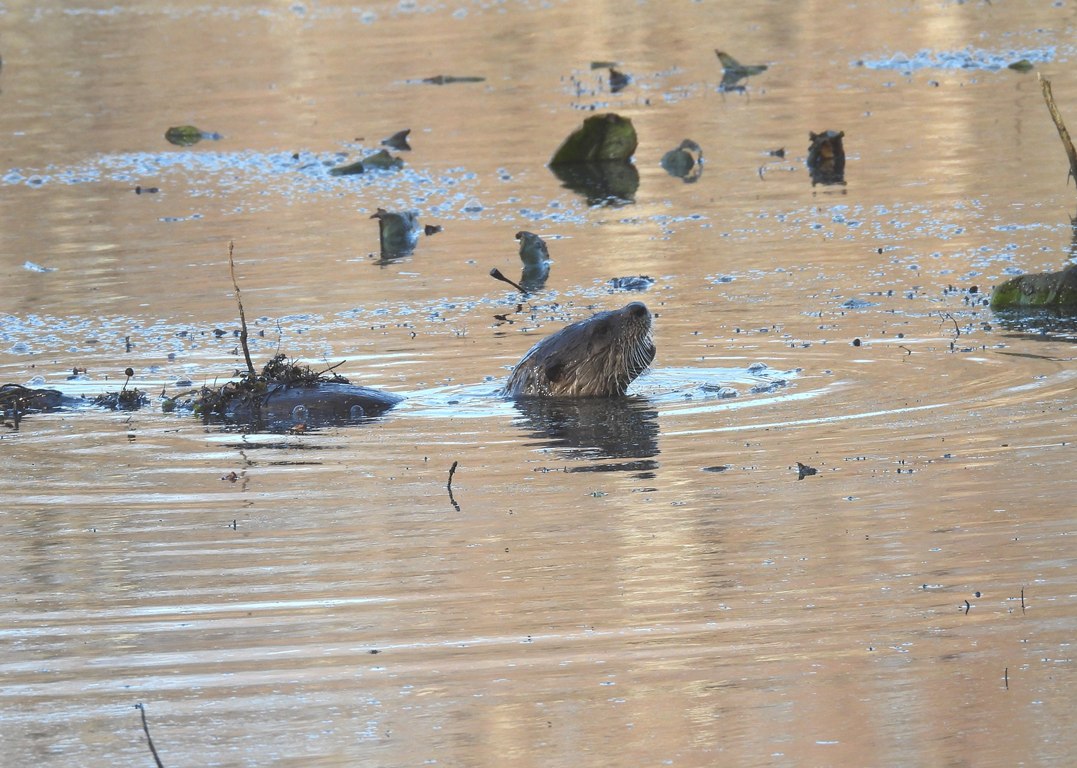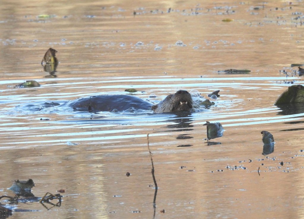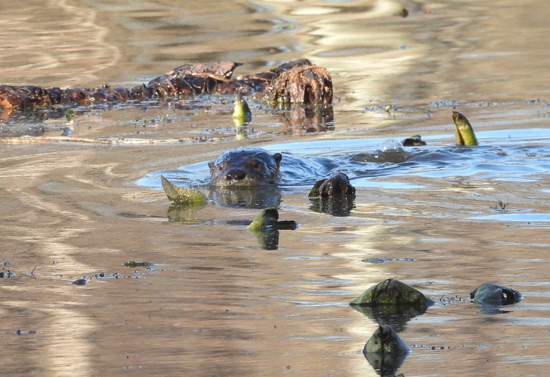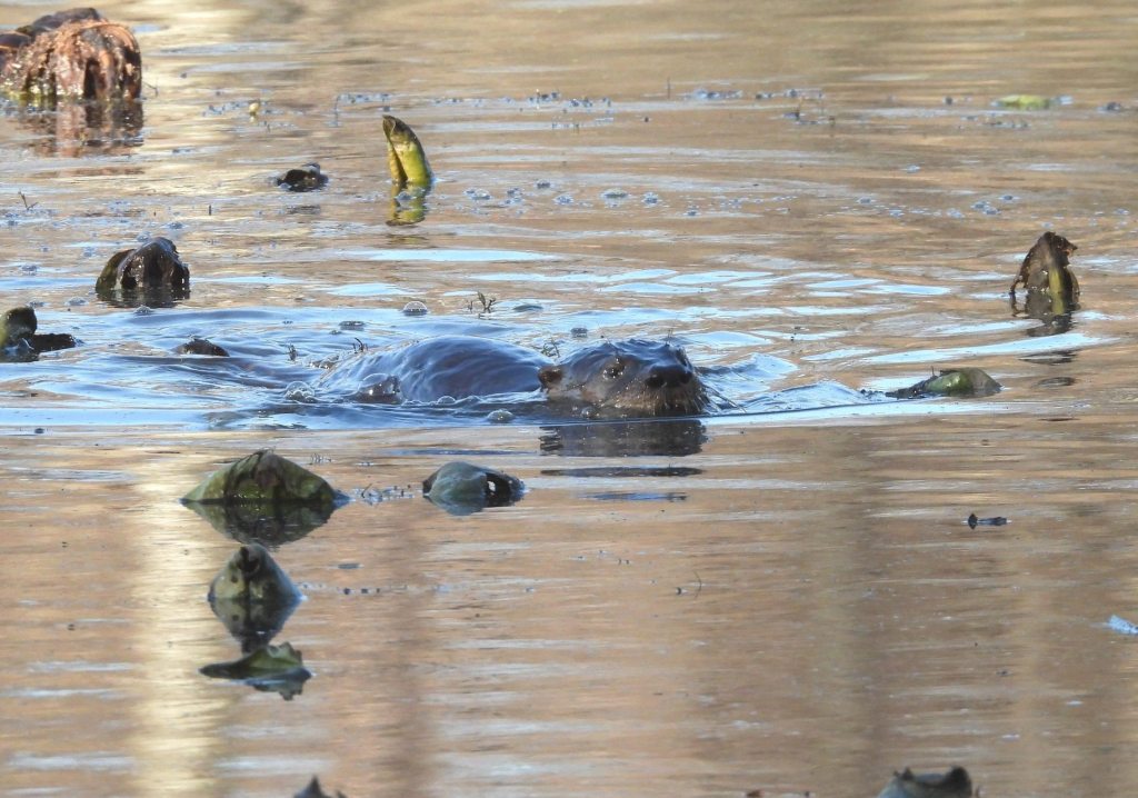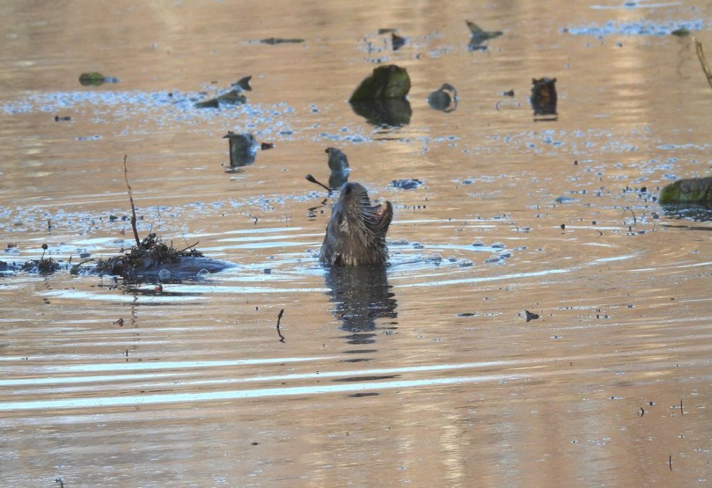 I walked down a wooded path to a shady spot along the lake’s edge where I occasionally observe ducks and different species of birds. This time, much to my surprise, a river otter surfaced and I was able to watch for a brief time as it hunted and munched on prey that it pulled from the shallow lakebed.