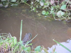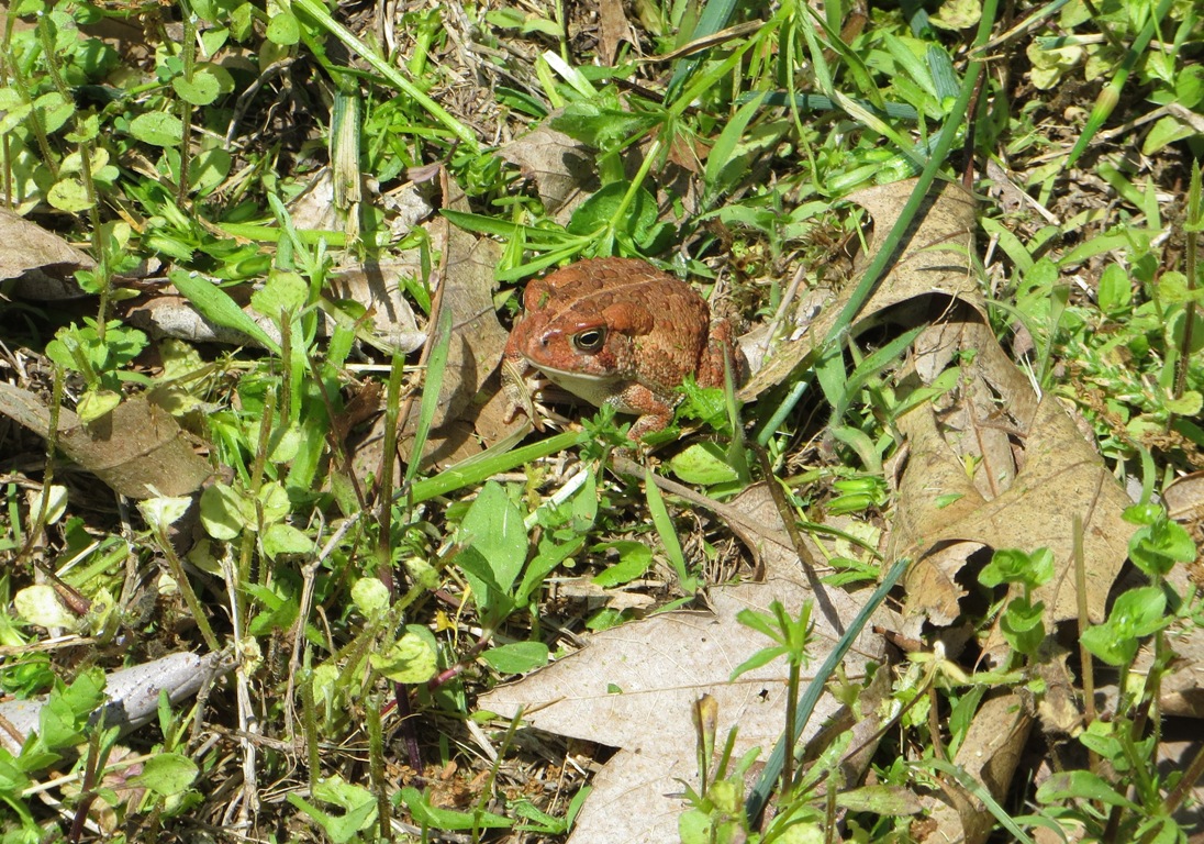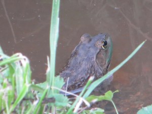 Usually I hear a loud “yelp” and a “plop”, followed by the sight of water rings left by the blur of a leaping frog. I seldom actually get a good glimpse of the frog sitting along a ditch or have time to take photos before the inevitable aforesaid scene. But lately, it seems like my stealth-like powers may be improving. 🙂