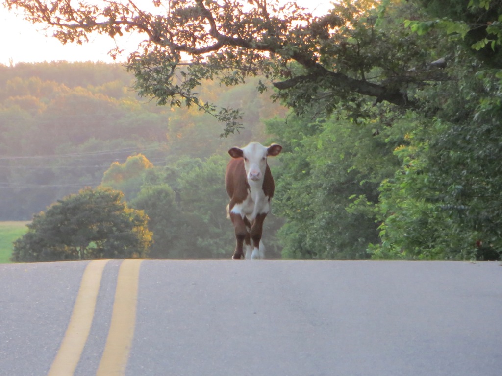 This little cow came strolling down the road to greet us during our country road walk last night. Not to worry! He quickly found his way back under the fence and to his Mom.