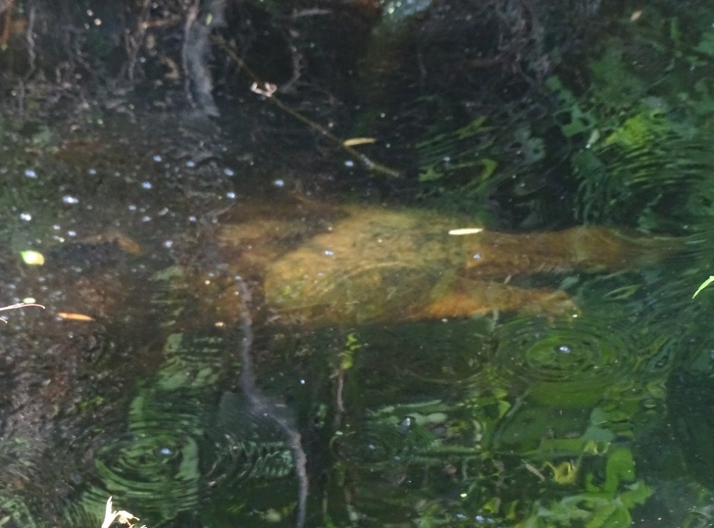 The first turtle stopped to bask in the sun for a while before continuing its journey across. Then it strolled through the grass, took a dive into a water-filled ditch, and disappeared.