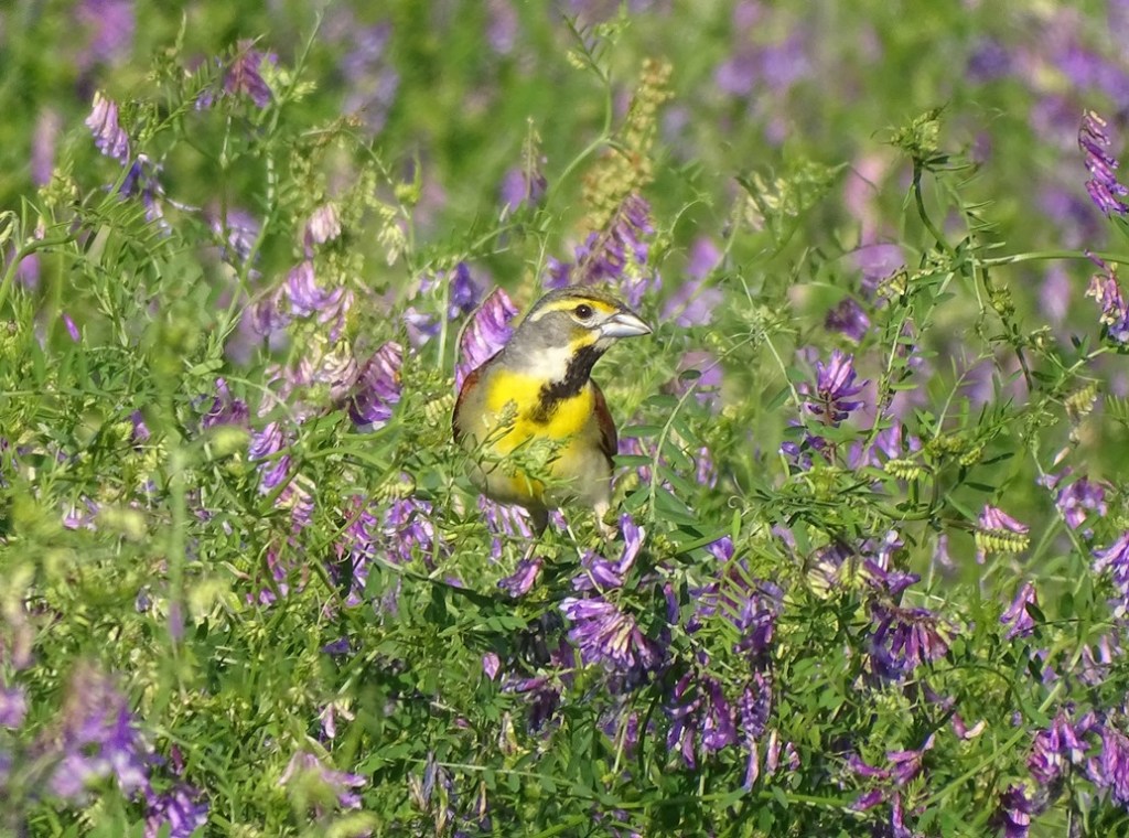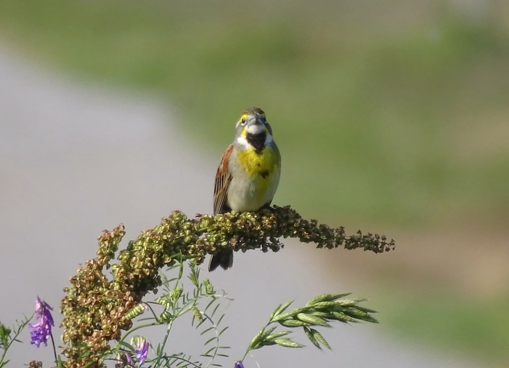 As you drive along the levee in the late spring, you can hear them calling to one another from among the dense, tall vegetation that grows along the embankment. Finally, you spot one perched on top of a plant stalk that’s swaying in the wind. He throws out his chest, tilts his head back and bellows a loud, sharp song. The dickcissels have once again arrived to nest and raise their young.