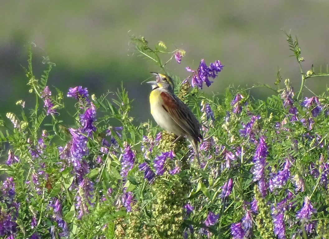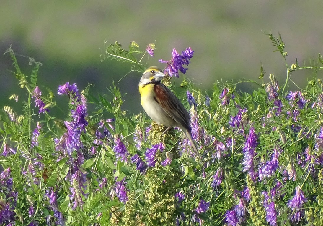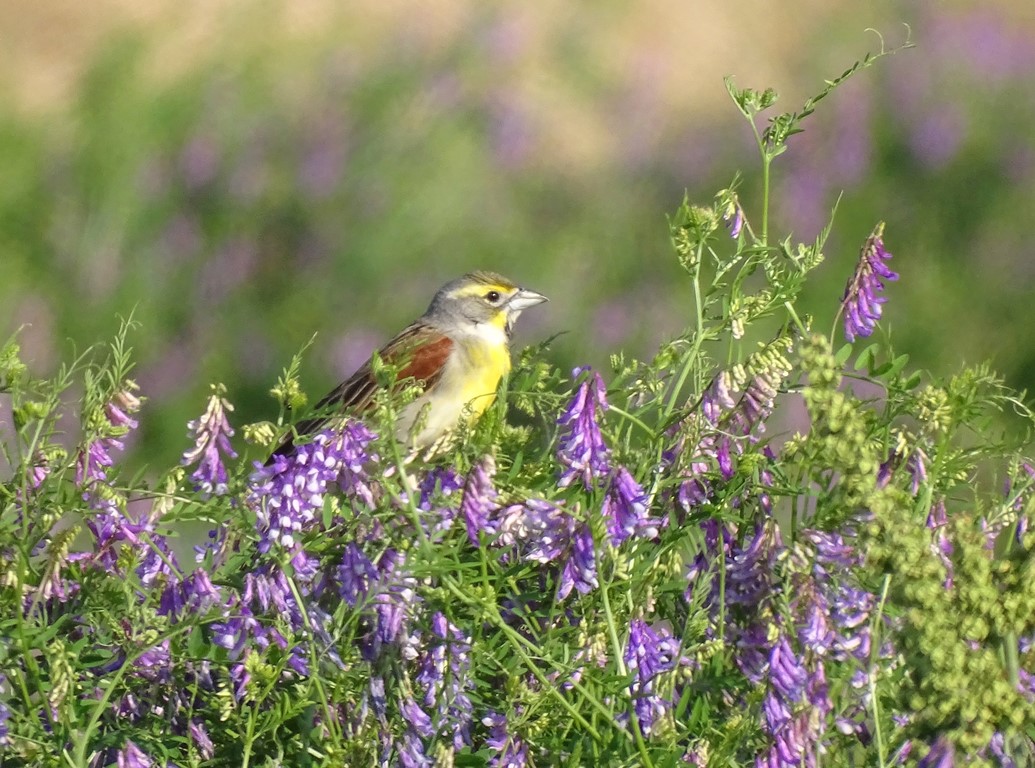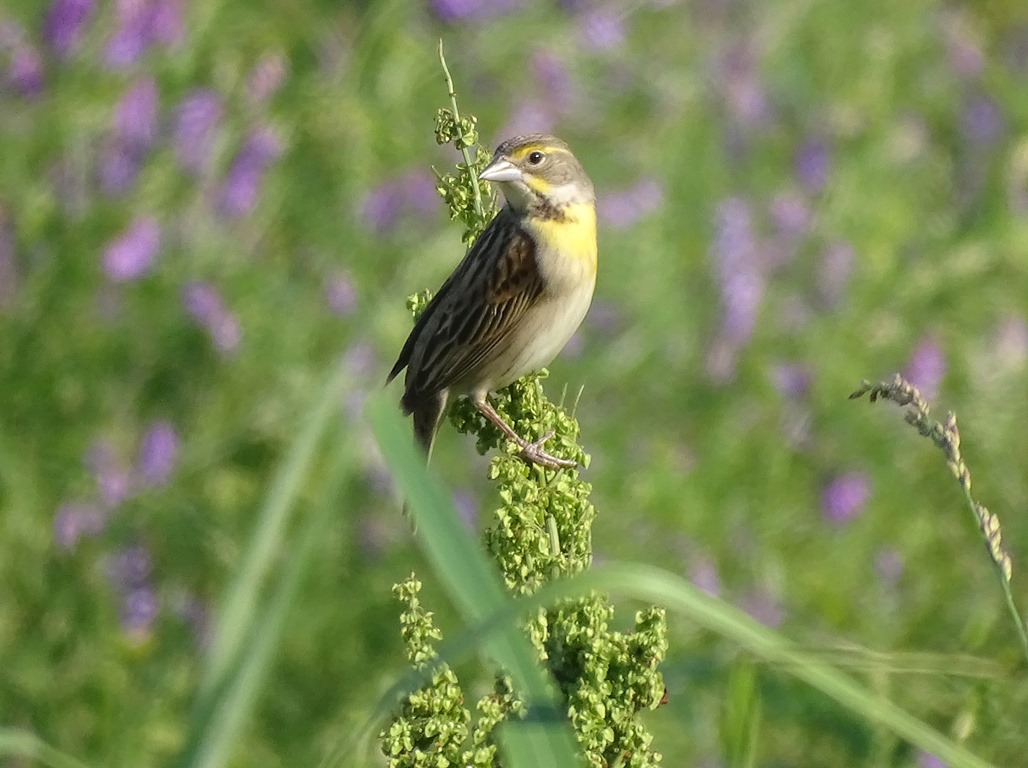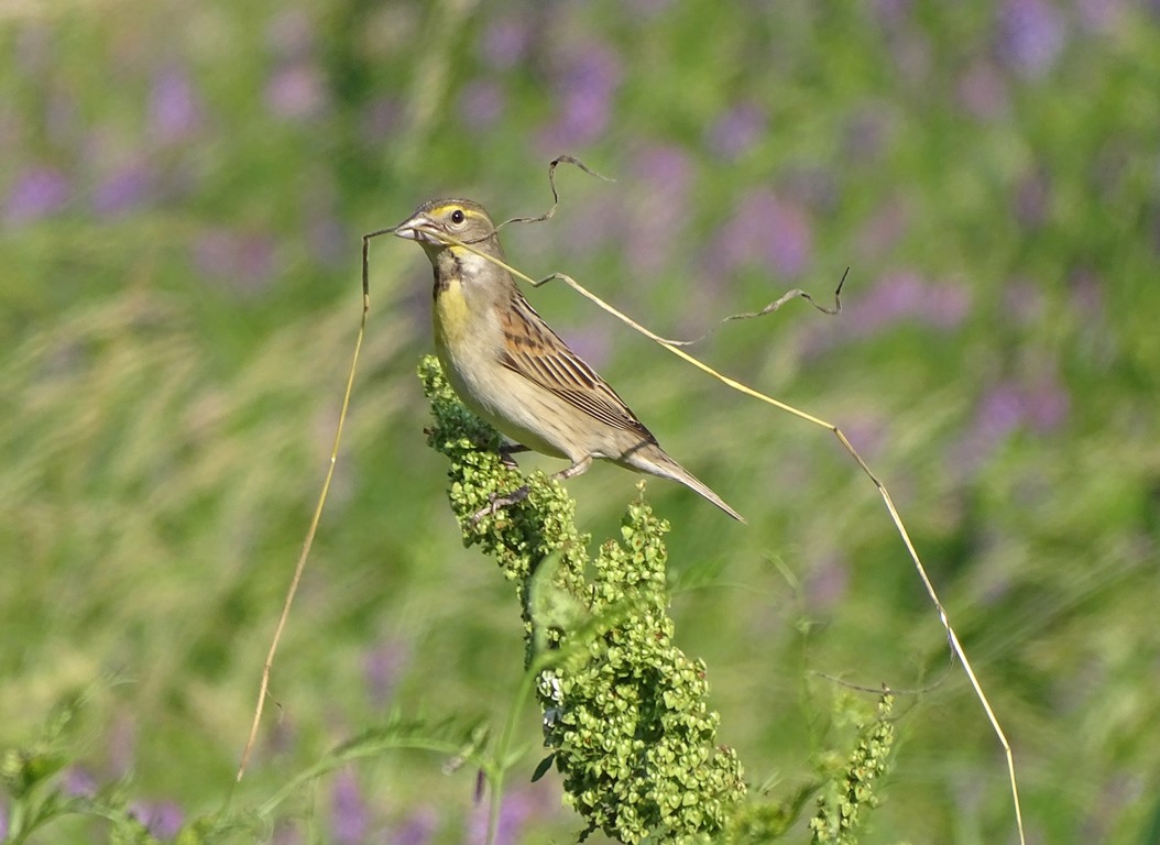 As you drive along the levee in the late spring, you can hear them calling to one another from among the dense, tall vegetation that grows along the embankment. Finally, you spot one perched on top of a plant stalk that’s swaying in the wind. He throws out his chest, tilts his head back and bellows a loud, sharp song. The dickcissels have once again arrived to nest and raise their young.