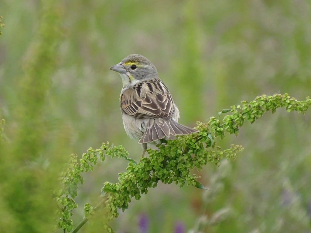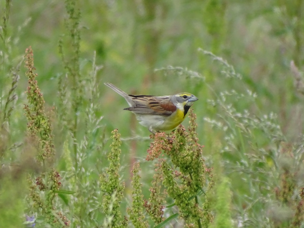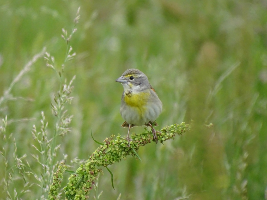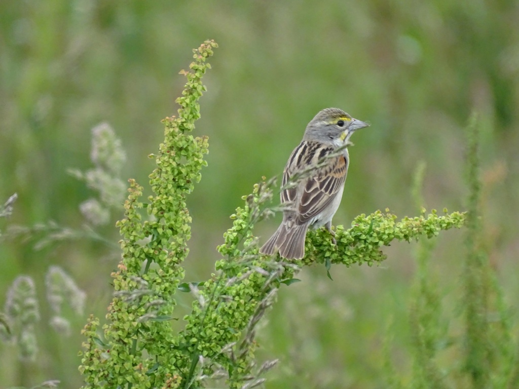 I look forward each spring to visiting the Mississippi levee in hopes of a glimpse of this small bird. As you drive along, you can hear the calls of Dickcissels concealed in the dense, tall grass along the road. Occasionally, one will fly up and perch on a swaying stalk — guarding their territory, plucking seeds from the plant heads, and belting out a loud song.