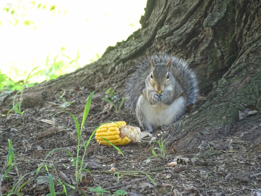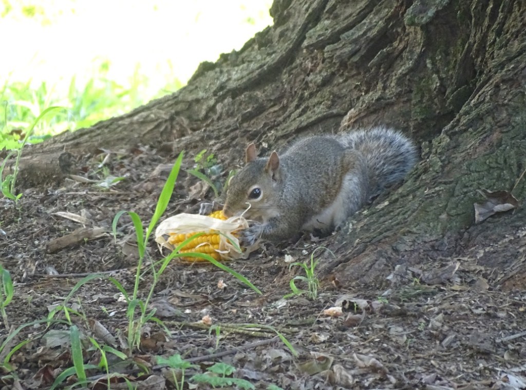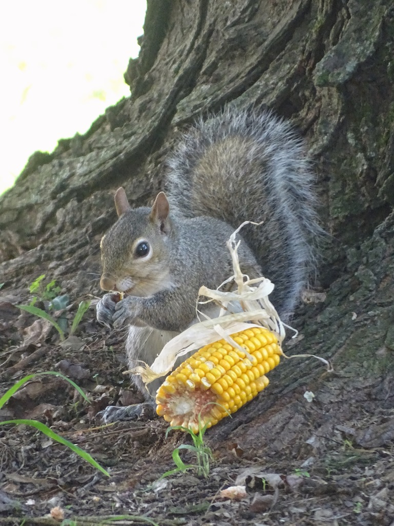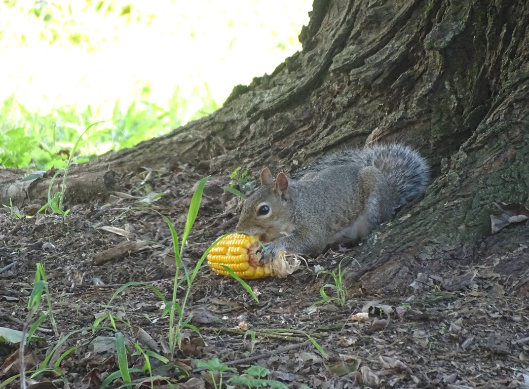 I spotted this squirrel as she finished toting a corncob from an adjacent cornfield to a nearby maple tree in our neighbor’s yard. She placed it on the ground and pulled it backwards to fit between the roots of the trunk. There, in her safe and comfortable spot she sat, enjoying her delicious prize, one kernel at a time.