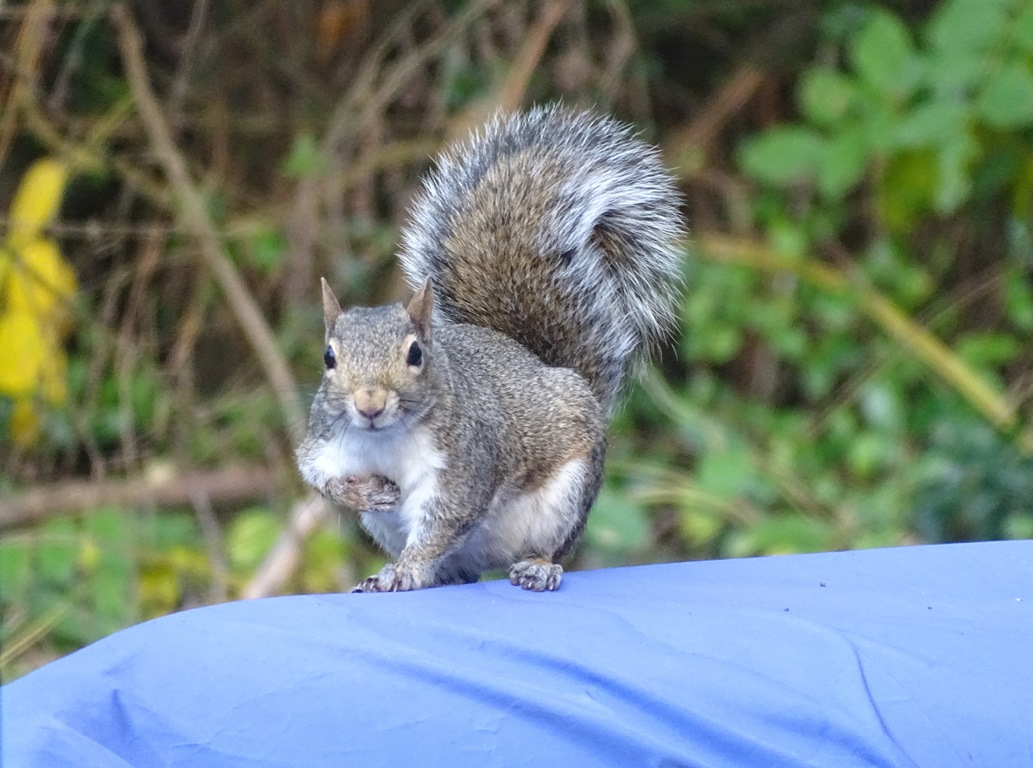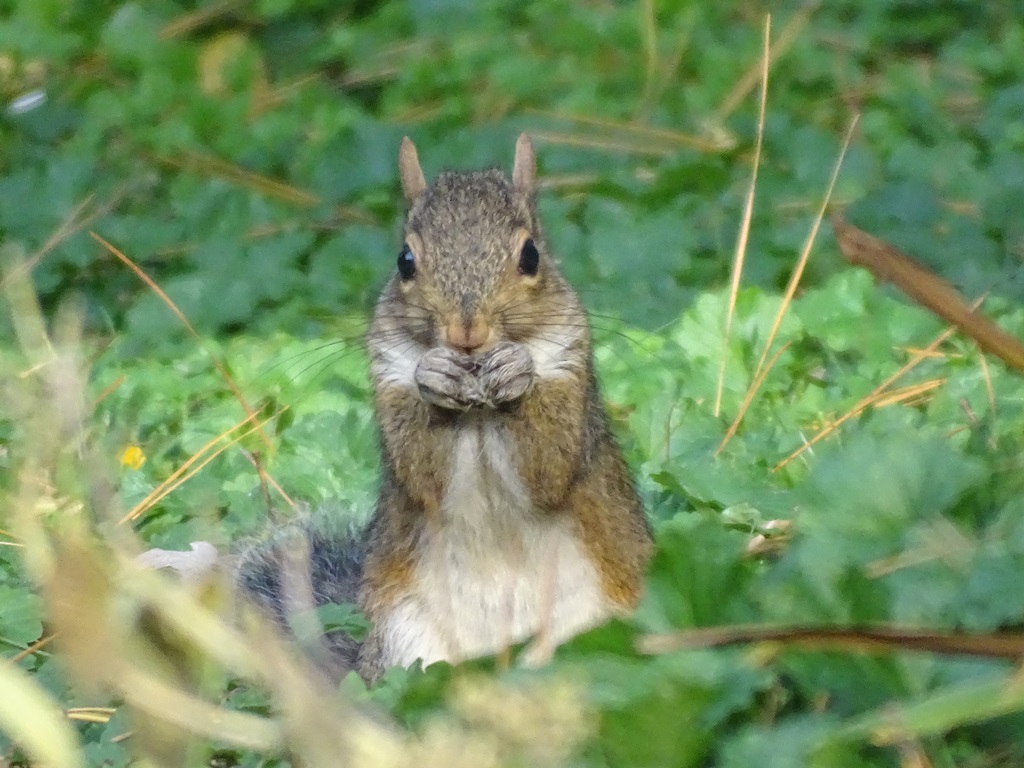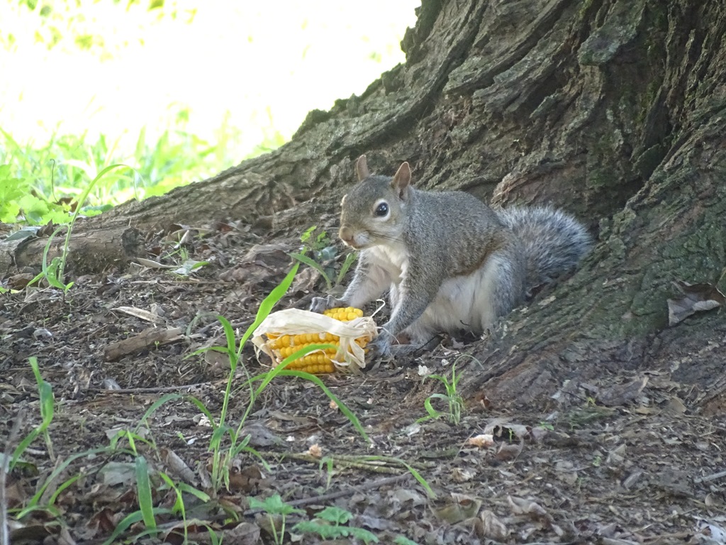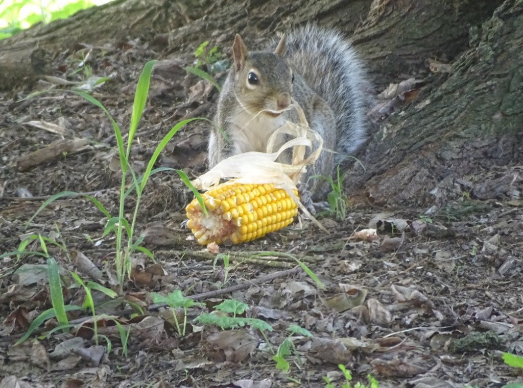 I spotted this squirrel as she finished toting a corncob from an adjacent cornfield to a nearby maple tree in our neighbor’s yard. She placed it on the ground and pulled it backwards to fit between the roots of the trunk. There, in her safe and comfortable spot she sat, enjoying her delicious prize, one kernel at a time.