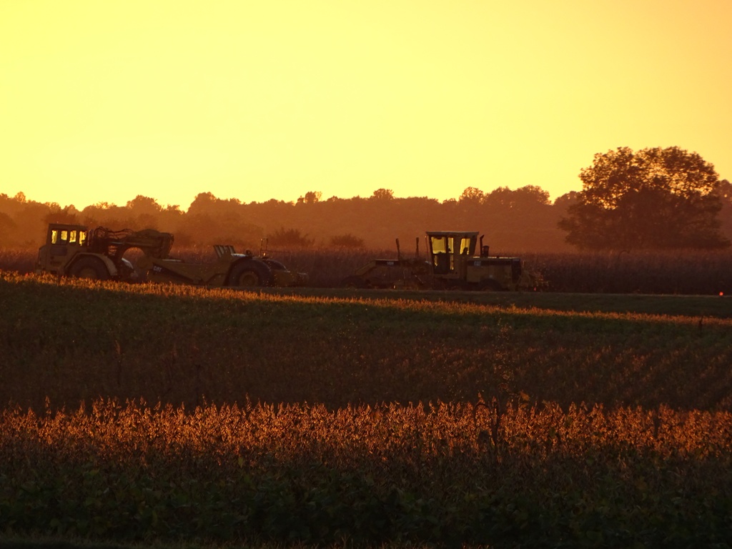 Progress is being made on a segment of Interstate 69, also known as the NAFTA Superhighway, through part of Northwest Tennessee. When completed, it is expected to foster commerce with Canada and Mexico and help connect the area to other interstates. These photos show machinery, which is being used in road construction, parked between a corn field and a soybean field as the sun goes down at the end of the day.