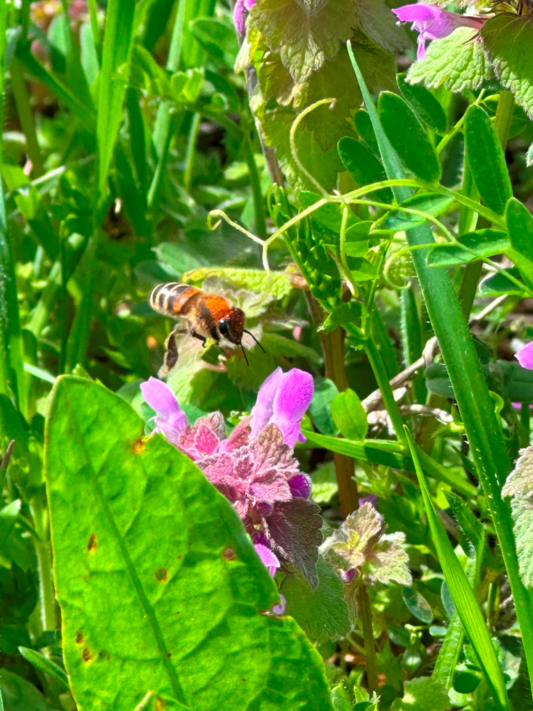 Purple Dead Nettles, with their pink tube-like flowers and burgundy upper leaves, were blooming along the Mississippi levee. Various types of bees were flying about among the wildflowers, attracted by their nectar.