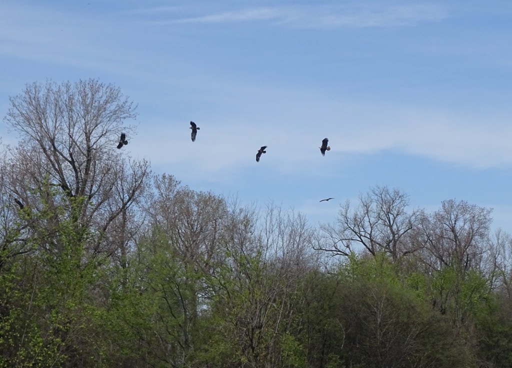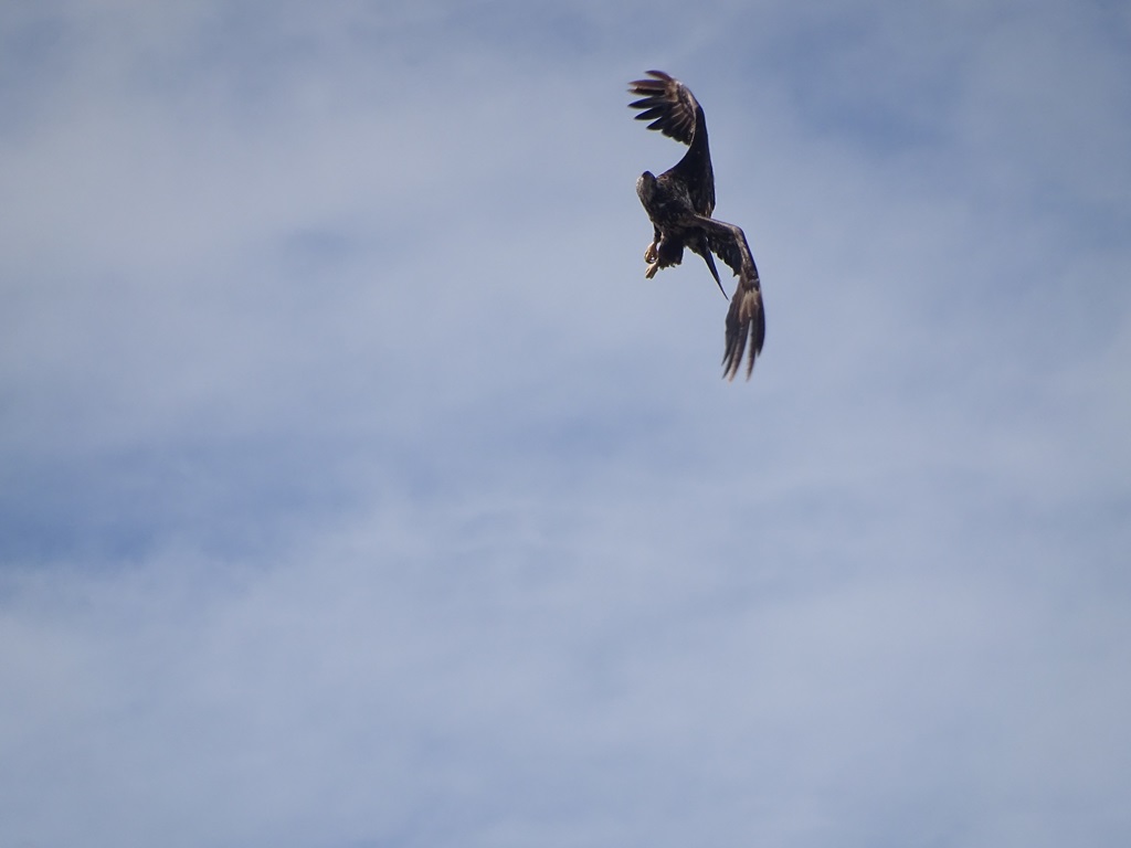 While watching the bees and butterflies, out of nowhere, a group of six eagles consisting of at least one adult and several juveniles, came swooping in from overhead. Their loud screeching and erratic flying stirred up quite a commotion.