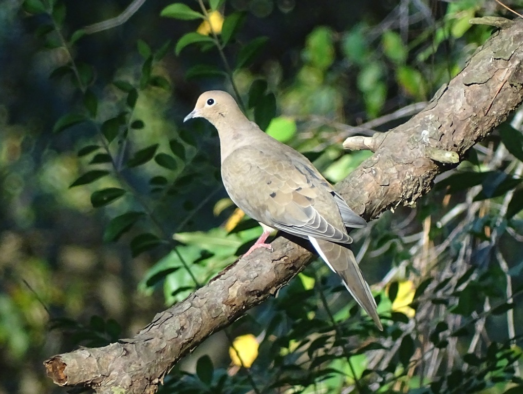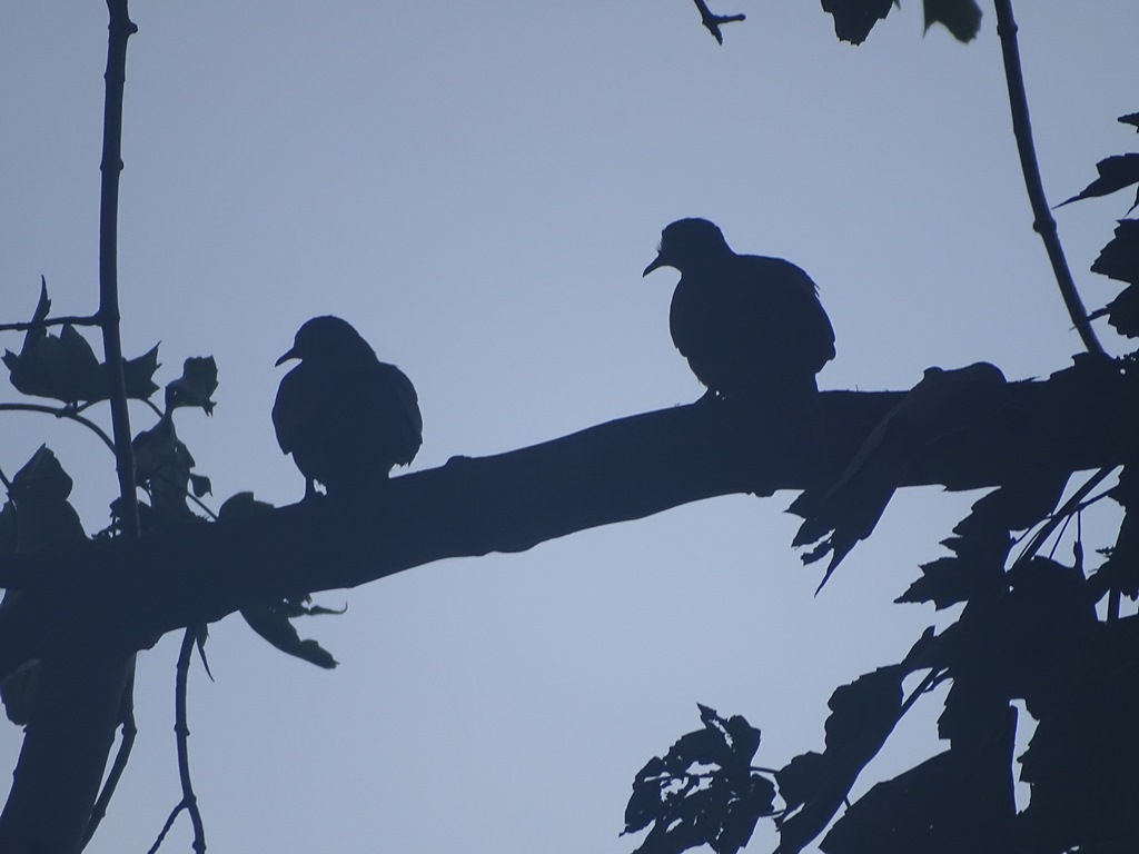 Mourning doves are commonly seen sitting in our pine trees or searching on the ground for sunflower seeds that have fallen from the feeders. They often have favorite perches where they sit, and from which their distinctive coos can be heard. However, they are easily startled, and take off like a shot. Their initial flight produces a sharp whistling sound, followed by the gentle flutter of their soft wings.
