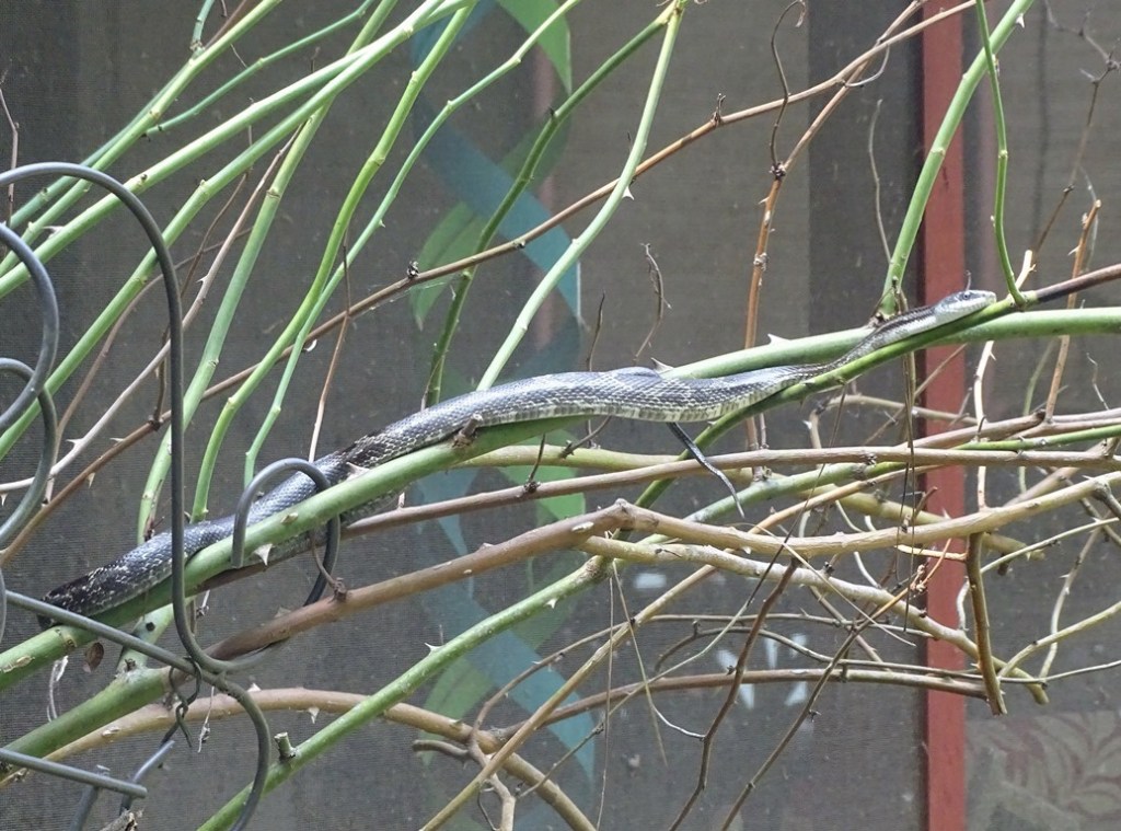 One afternoon I went out to change the hummingbird feeders which hang up outside our back screen porch. As I started to reach across the rose bush branches to replace the bottles, I saw it. Stretched out and wrapped in neatly among the stems, lay a non-venomous gray ratsnake.