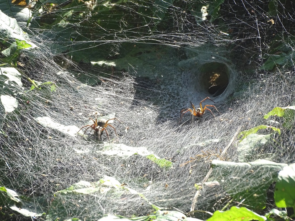 In order to capture their prey, funnel-weaving spiders construct flat, non-sticky webs featuring a funnel-shaped retreat on one side. The spider remains concealed at the rear of the web, hidden from view, until the silk threads are disturbed. Quickly it scurries out, seizes the prey, and takes it back to their funnel for feeding.