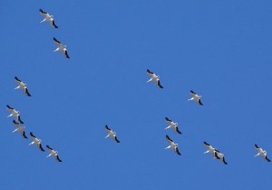 As I was standing and looking out over the lake, I felt a little disappointed at the apparent lack of wildlife in the immediate area. Then I heard a passing kayaker tell one of his companions to “look up”. As I lifted my eyes, I was amazed to see a large flock of white pelicans quietly soaring right above my head. Such a beautiful and graceful sight that I would have otherwise missed if I hadn’t overheard the suggestion to look up.